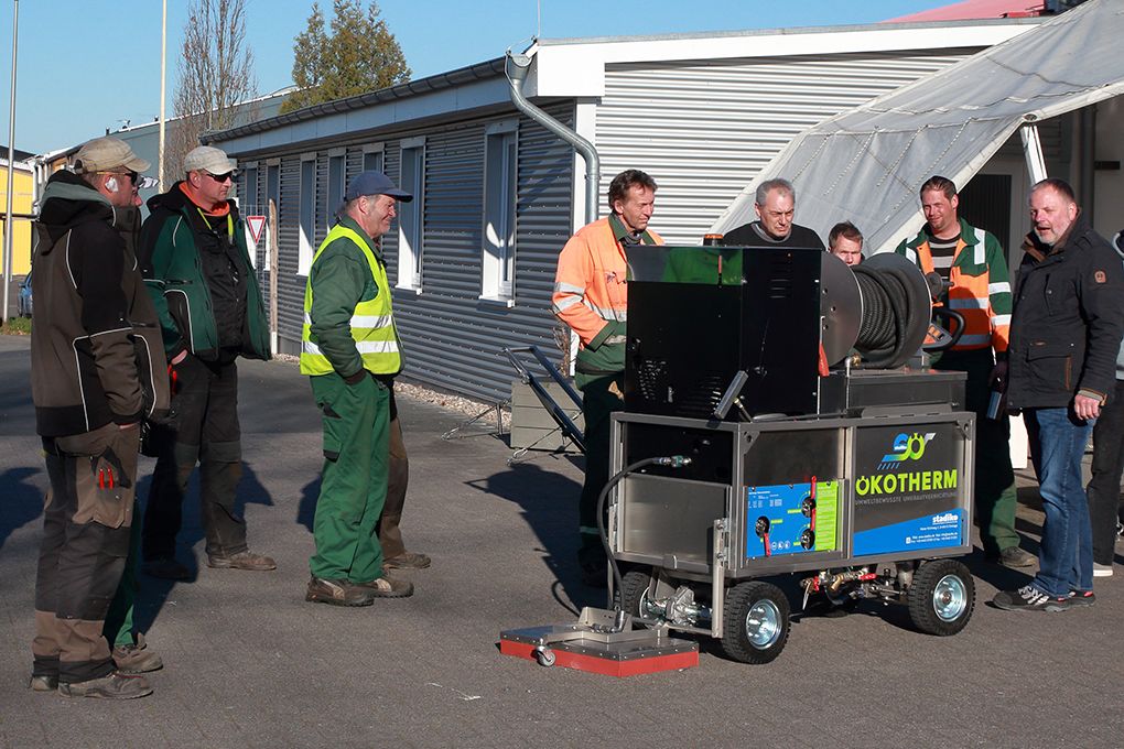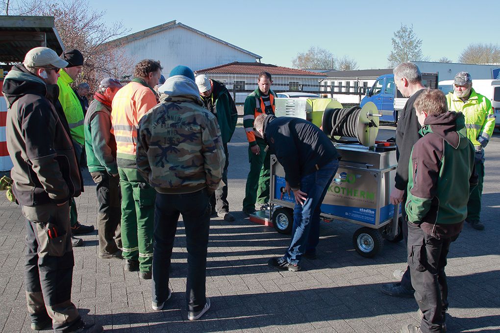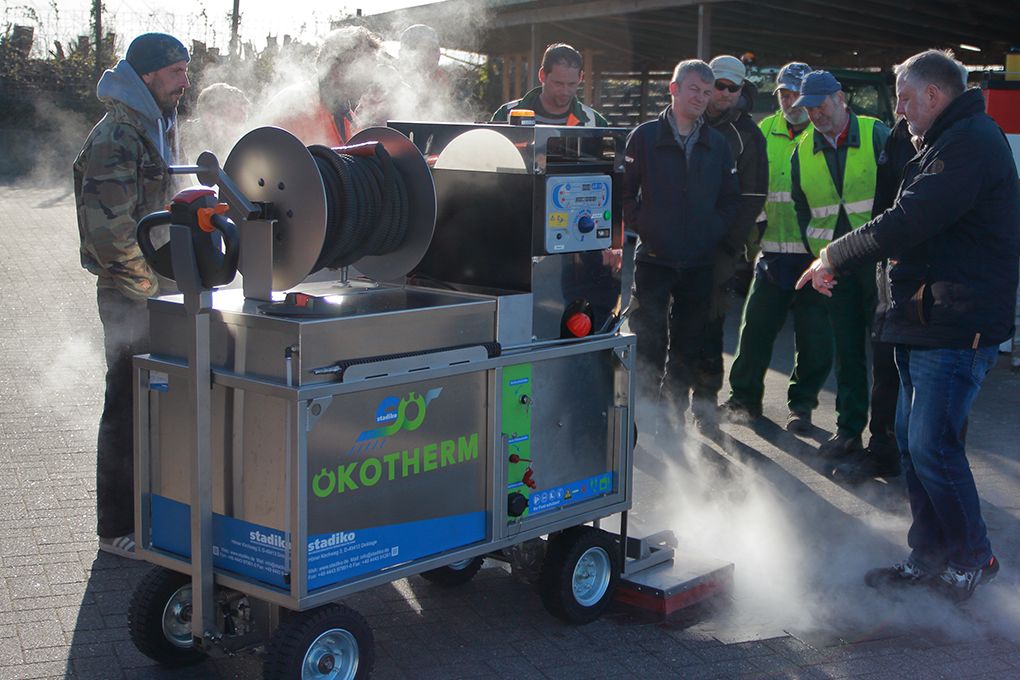 Die Firma Stadiko gratuliert zum Erwerb des „Ökotherm“. Pünktlich mit dem Saisonstart zu Ostern haben die Schleswiger Werkstätten ihr erstes Gerät geliefert bekommen. In einem kleinen Workshop wurden die Leiter der unterschiedlichen Bereiche unterwiesen und mit den technischen Details vertraut gemacht. Für viele war die Art der Wildkrautbekämpfung eine ganz neue Erfahrung. Aber alle waren sich schnell einig. Durch die Einfachheit und Kompaktheit der autarken Maschine können sich auch Mensch mit unterschiedlichsten Behinderungen leicht auf das Gerät einstellen.
