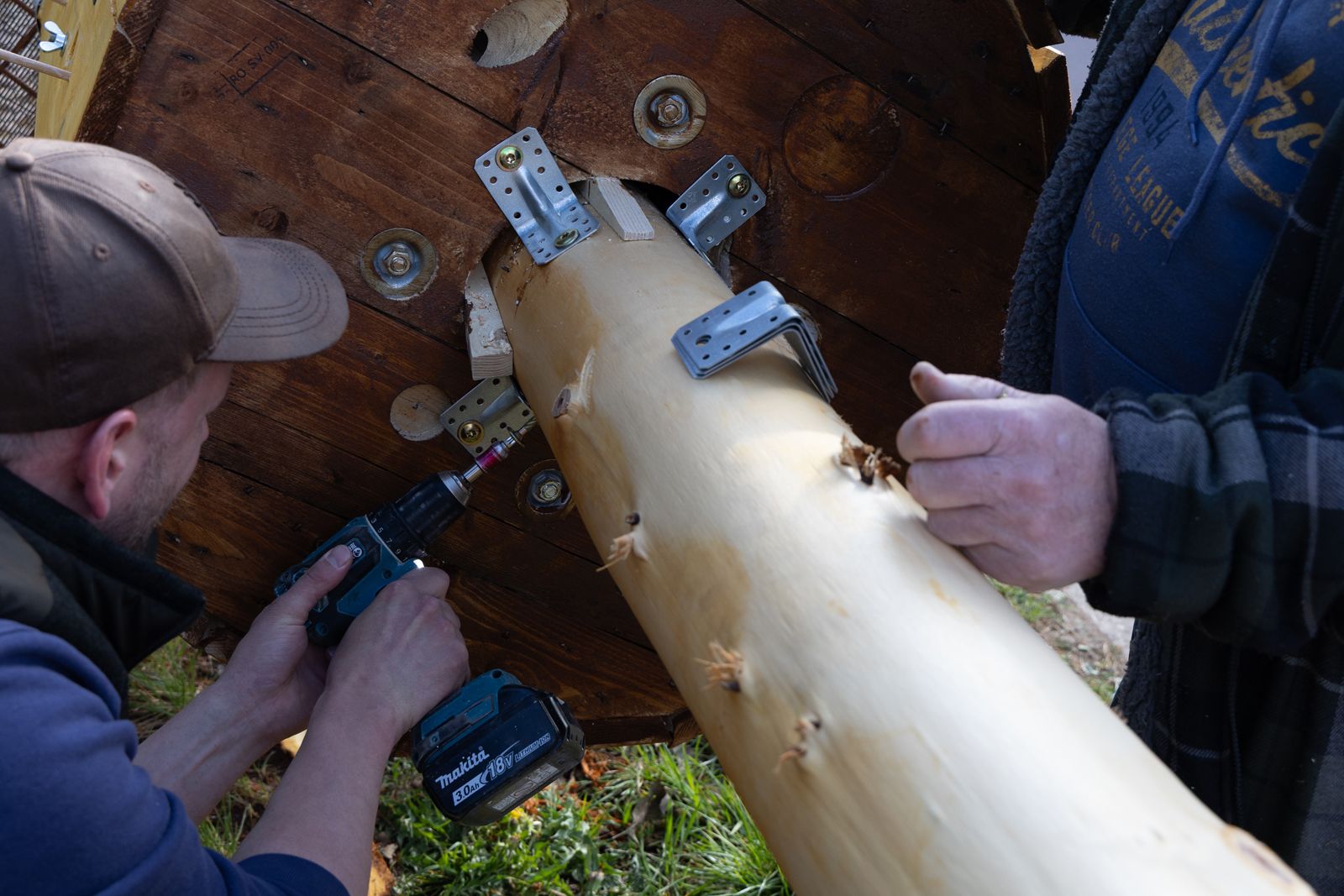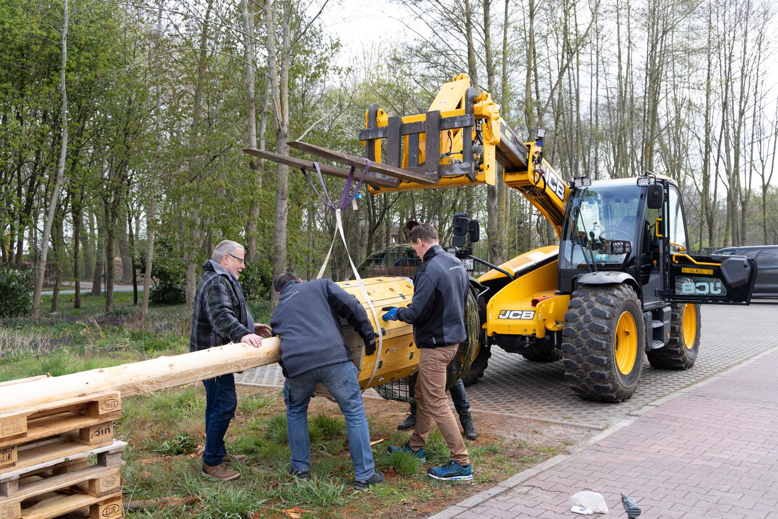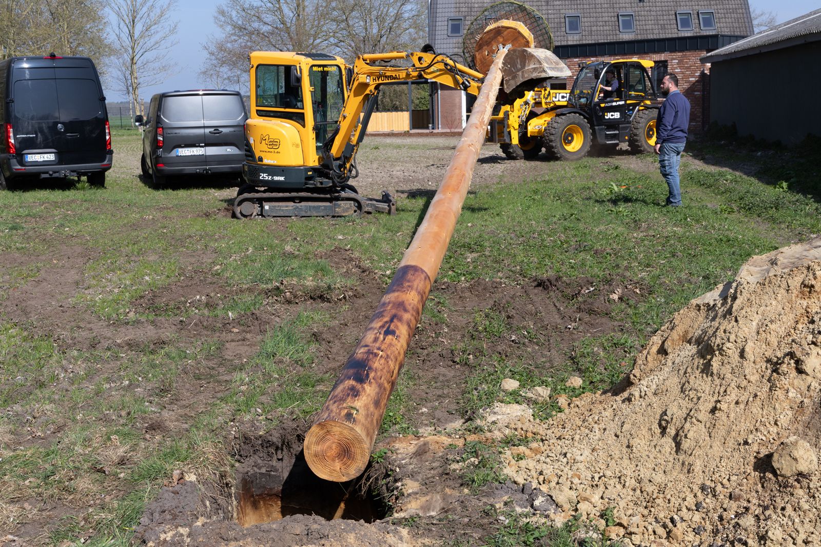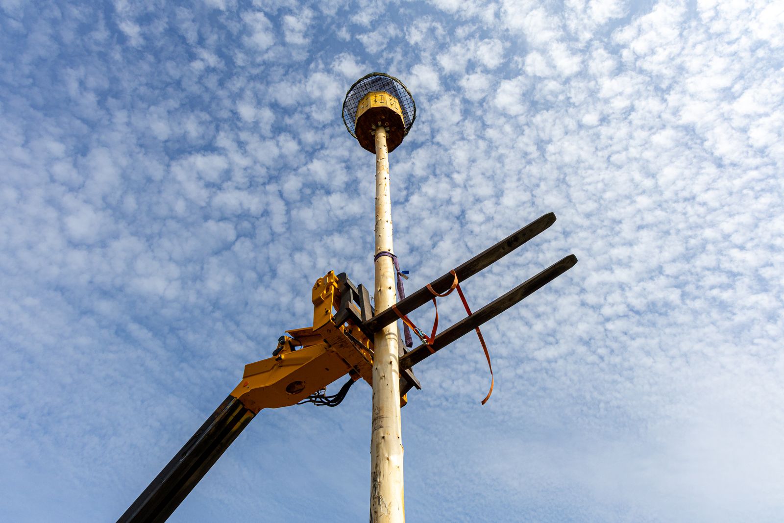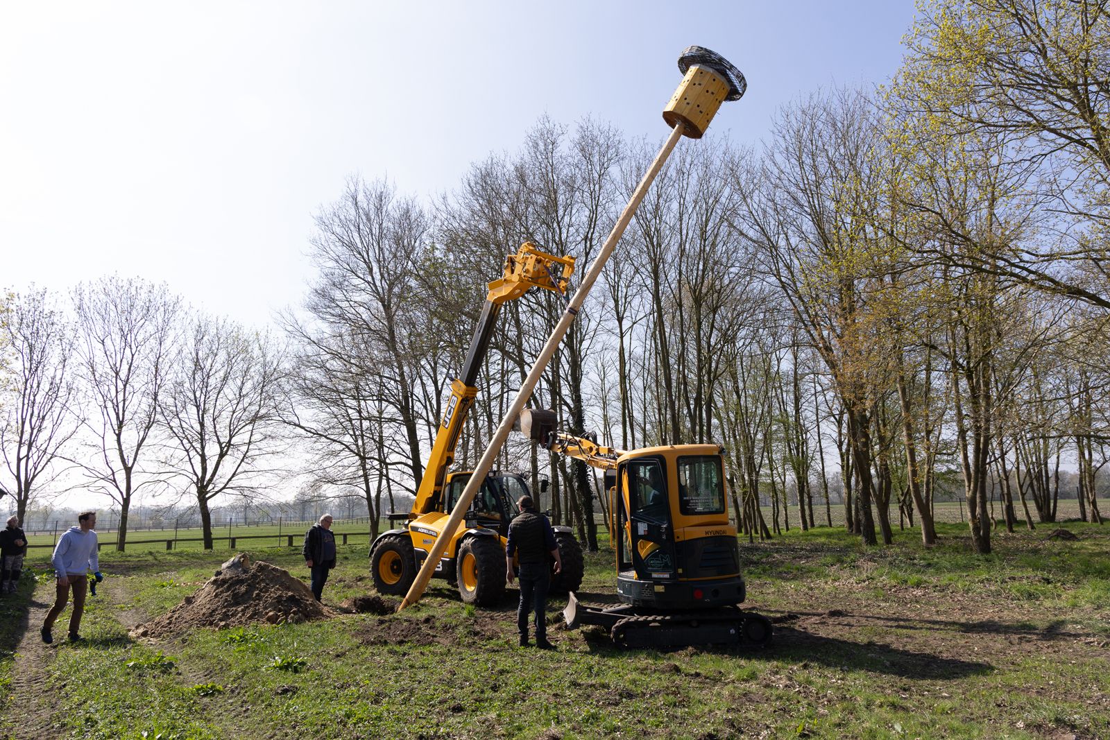 Mit schwerem Gerät haben wir den vorbereiteten Stamm schließlich zum Zielort transportiert und vorsichtig aufgerichtet. So ist ein stabiler und sicherer Nistplatz entstanden, der hoffentlich bald von einem Storchenpaar bezogen wird.