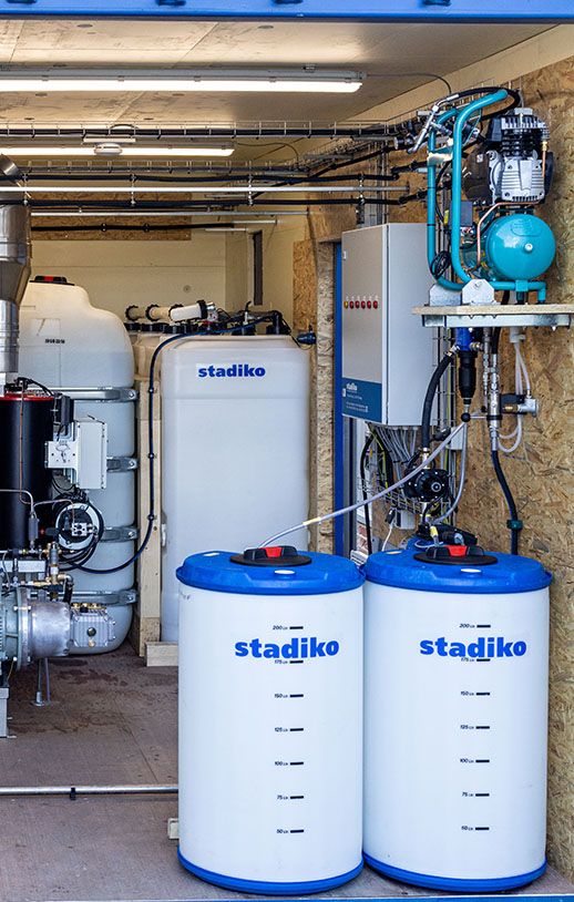 Außerdem wurden bei der Planung eine Hochdruck-Schaum-Anlage sowie eine Desinfektionseinheit berücksichtigt, die beide über eine Steuerung automatisch die eingesetzten Mittel dosieren.