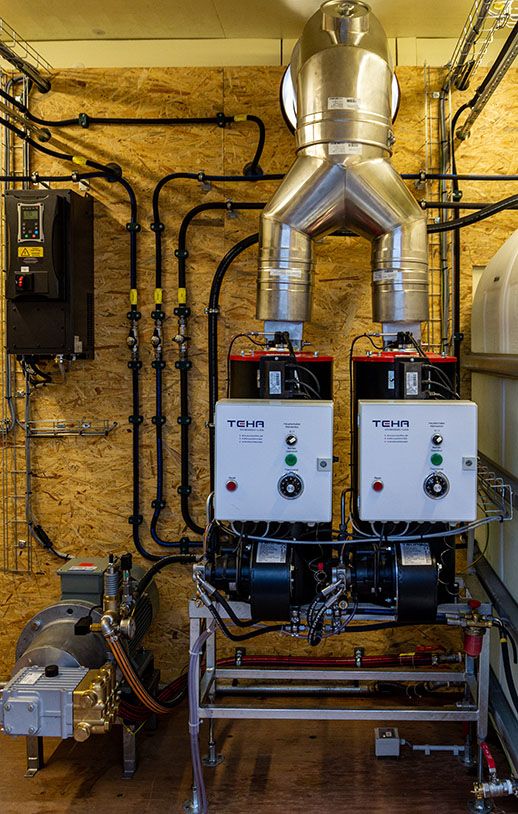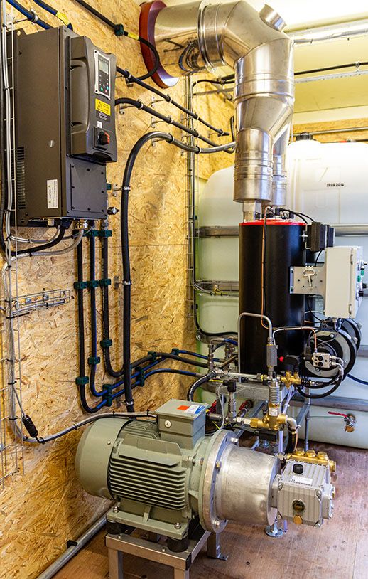 Viele Komponenten aus dem jahrzehntelangen Bau von mobilen und stationären Hochdruckreinigern konnten in dieses Projekt übertragen werden. Das Herzstück ist eine zuverlässige frequenzgeregelte Heißwasser-Hochdruckanlage für zwei Anwender.